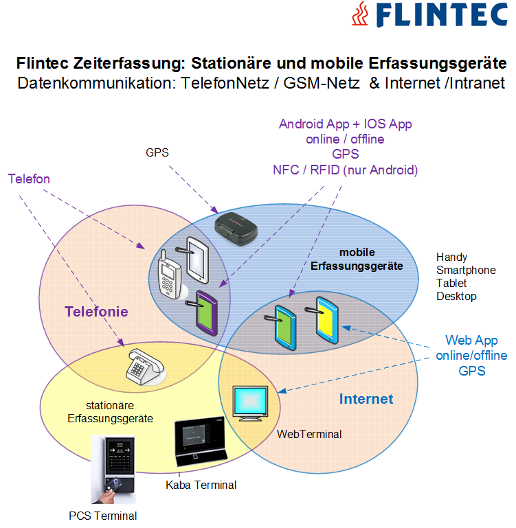 - Die verschiedenen Erfassungsgeräte Handy, Smartphone und Tablet sind miteinander kombinierbar, auch mit der Flintec Zeiterfassung per Telefon und per GPS-Gerät